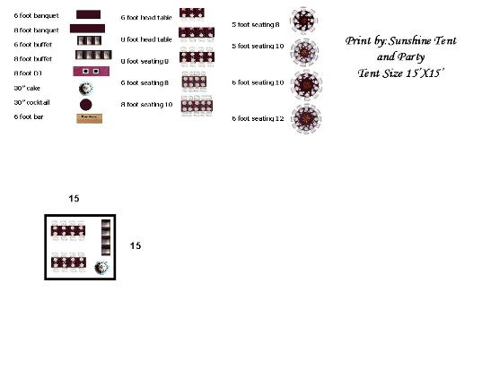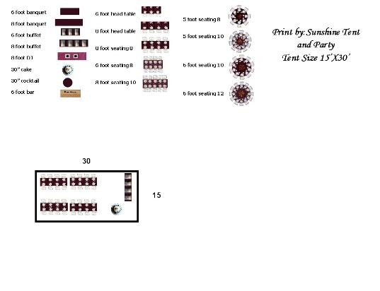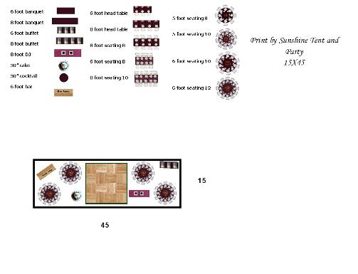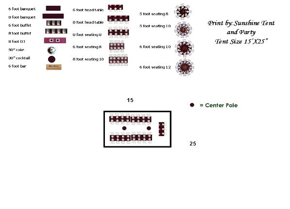 15X45 Seating 48 guests at 12 to a table. This tent is a frame style tent. Using a frame style tent offers some flexibility when laying out a tent. This is very helpful when placing a dance floor under a small tent.