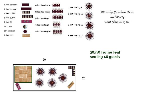 at 6 foot rounds tables seating 12 to a table. This tent is a frame style tent. Using a frame style tent offers some flexibility when laying out a tent. This is very helpful when placing a dance floor under a small tent.