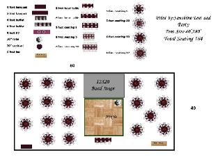 | This tent is a 40X80 frame tent with tent liner seating 180 guests. This tent size can accommodate approximately 150 to 250 guests depending on dance floor size and seating style. In addition to a 20X20 dance floor it also included a stage for a 7 piece band, bar area and gift table. We offer custom plans at no additional charge. This tented reception was based on the diagram on |